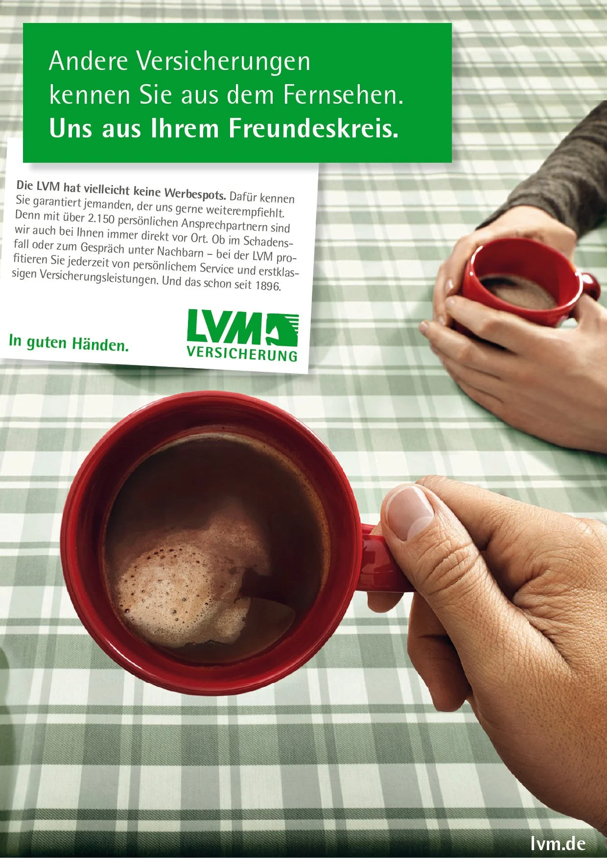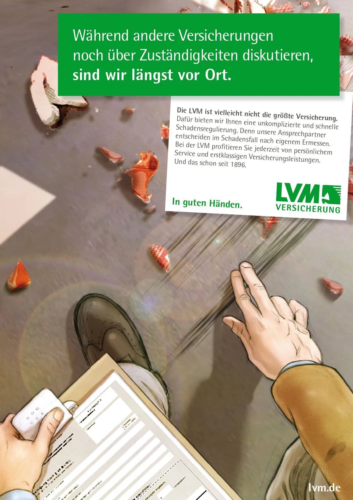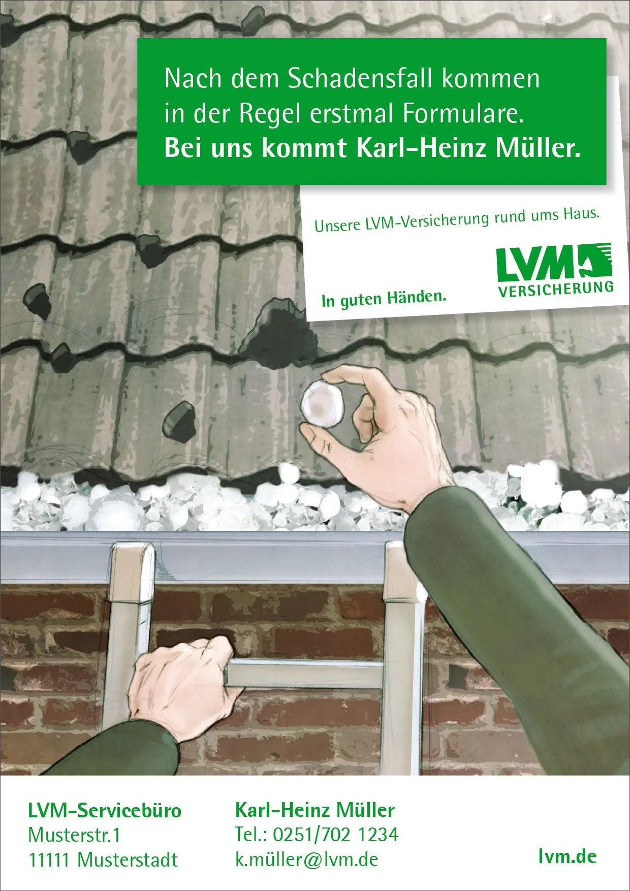 Unsere Lösung: Aus der subjektiven POV-Perspektive der LVM-Vertrauenspersonen sehen wir klassische Schadenfälle mit einer Headline, die nicht nur die USPs sondern auch die Haltung der LVM auf den Punkt bringen: hilfsbereit, bodenständig, nahbar & nachbarschaftlich.